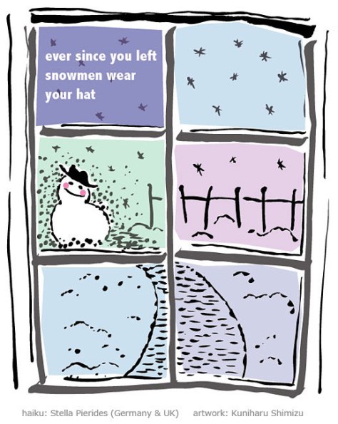 This haiga, using my haiku, was created by renowned haiga artist Kuniharu Shimizu. Kuni-san is also priest of Tenrikyo, advisor to the World Haiku Association, and judge of their haiga contests. I feel most honored that one of my snowman haiku was included in his current series of Snowman haiga.