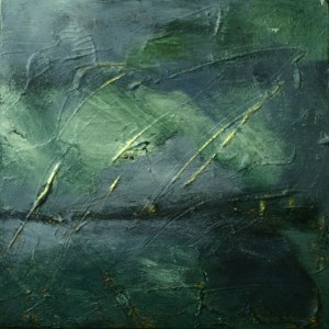 Using “mixed media, building up and scraping back areas of paint to capture the atmosphere, mass, and light of the landscapes,” she is creating landscapes of the mind. Exploring aspects of the search for “home,” for “rootedness” in the moment, she works on the most basic and important areas of being.