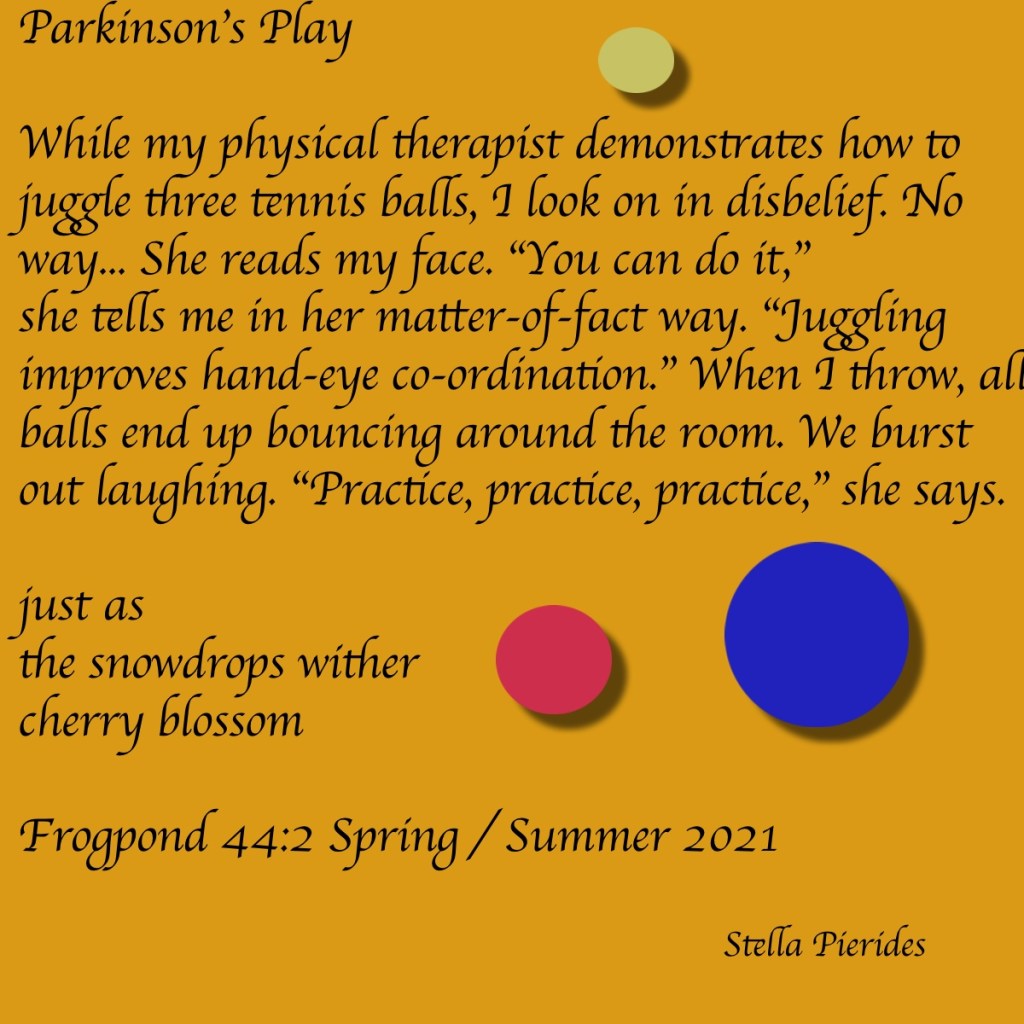 Here is one of my poems from page 207, initially part of a haibun published in “Contemporary Haibun Online” 17.1, and recently included in my juxtaEIGHT article ‘Parkinson’s Toolbox: The Case for Haiku’ (pp.37-61)