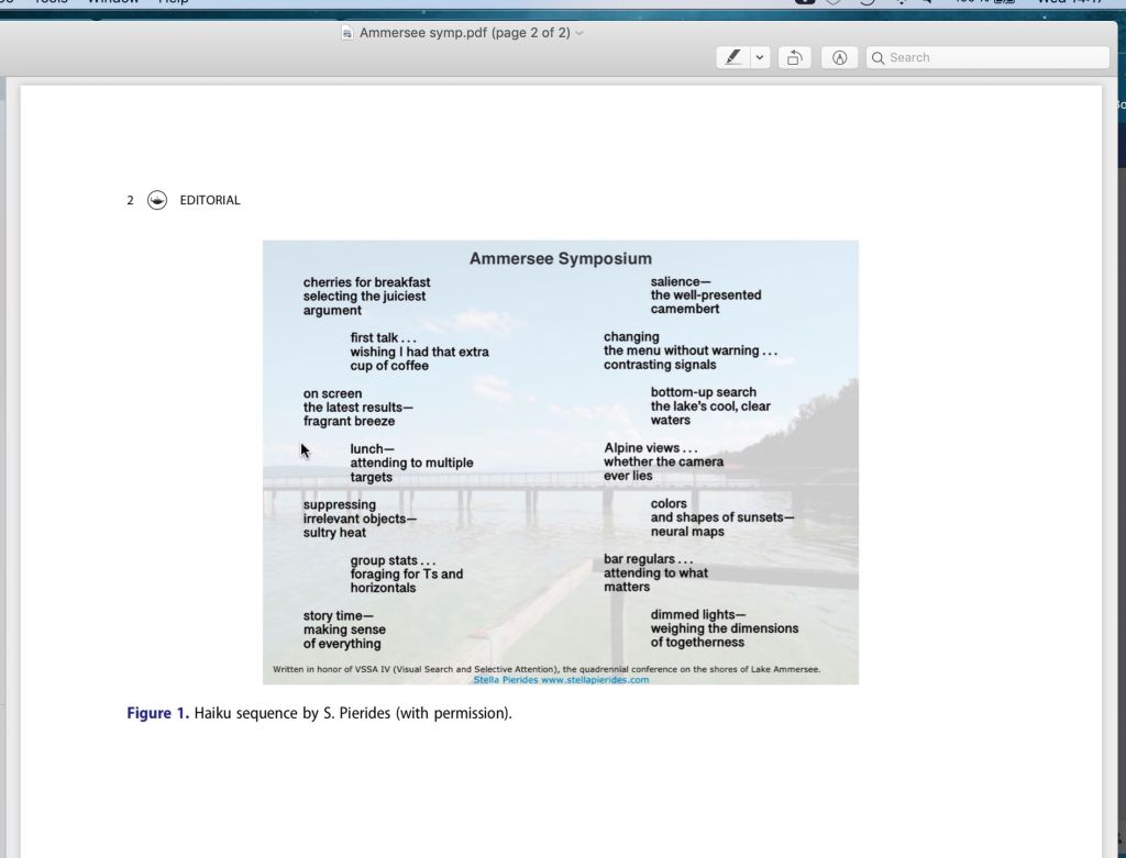 Capturing a scientific symposium in a haiku sequence! Remember the #haiku sequence on the Ammersee conference I wrote in 2018? It was included with the conference proceedings in a special edition of Visual Cognition, Vol. 27, issues 5-8, May/September Routledge, 2019 – (scroll to p.2 of the editorial). Why have a volume of papers when you can describe the whole thing in a few haiku? ![]()